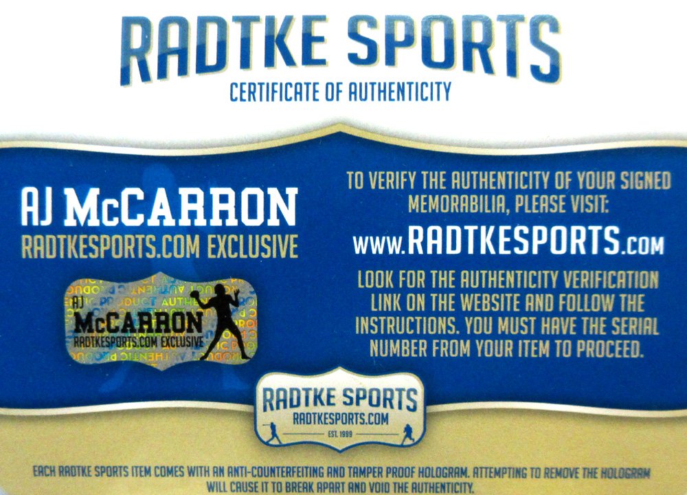 An Alabama Crimson Tide Sports Illustrated hand signed by AJ McCarron. The item and signature are in excellent condition - AJ set the SEC on fire at Alabama and now looks to make his mark on the NFL. Radtke Sports is the exclusive autograph company for AJ. Look for the Radtke Sports AJ McCarron hologram on your memorabilia to ensure authenticity! - AUTHENTICATION: The item is accompanied by a Radtke Sports AJ McCarron Certificate of Authenticity - Radtke Sports AJ McCarron Serial Numbered and Databased Hologram - Picture of AJ from the Signings - *** Radtke Sports uses professional lighting for our product images that may show reflections. We also feature watermarks on our proof pictures. The picture you receive will NOT have a watermark***