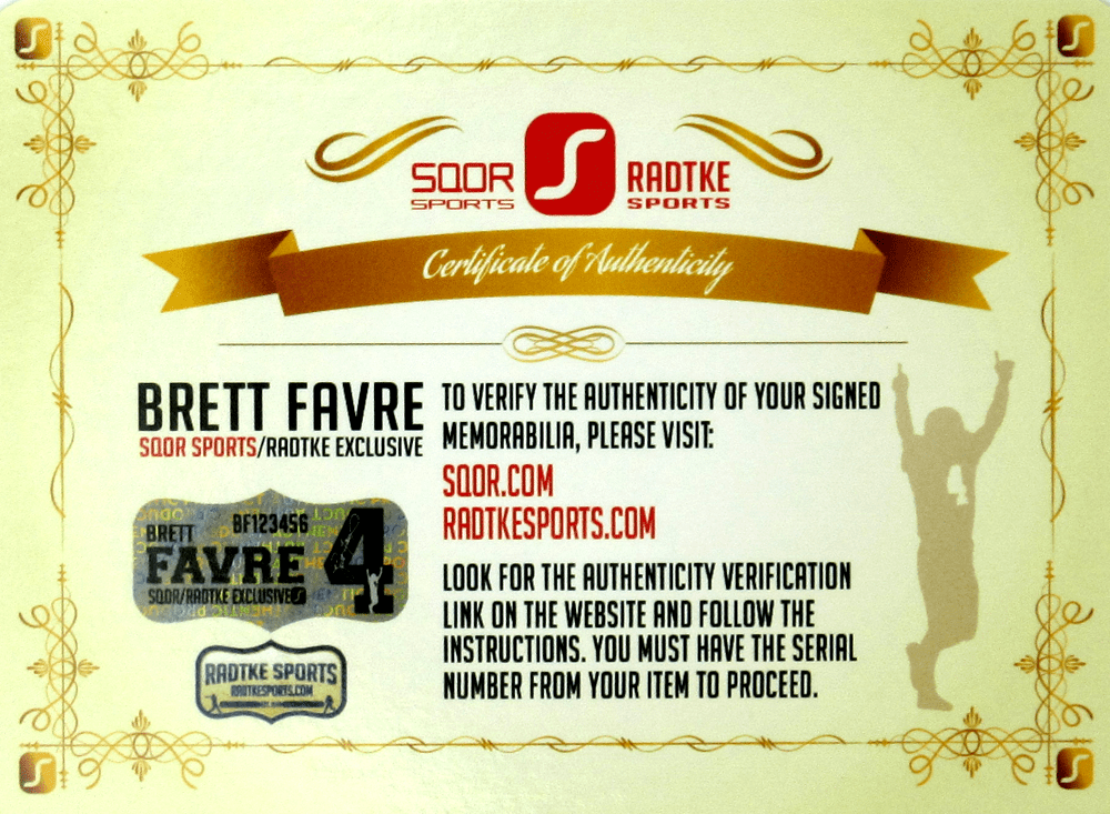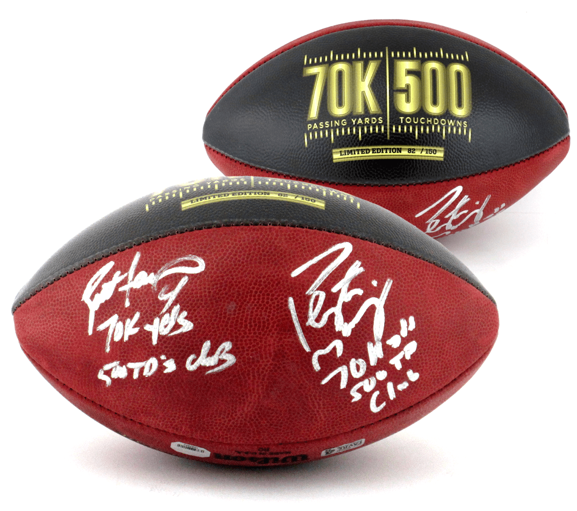 A Wilson Authentic 70K Passing Yards and 500 Touchdown Club Commemorative NFL Football hand signed by Brett Favre and Peyton Manning. The item and signatures are in excellent condition. In addition to signing his name, each player inscribed 70K Yards 500 TDs Club on the item to commemorate their illustrious careers - Brett and Peyton are two of the most iconic players in NFL history and now you can own this incredible piece celebrating the careers of these two true legends - This item is limited edition of 150. Buyer will receive a random number from the edition - Radtke Sports and SQOR Sports are the exclusive memorabilia company for Brett Favre. Buy from the only source for current, authentic Brett Favre memorabilia! - The item is accompanied by an exclusive Radtke Sports/SQOR Sports Certificate of Authenticity - Radtke Sports/SQOR Sports Serial Numbered and Databased Brett Favre Hologram - Picture of Brett from the Signing - For Peyton there is a Fanatics Authentic Serial Numbered and Databased Hologram on the item and a photo of Peyton from the signing - Any Questions please call 770-945-6945 - The picture you receive will not have a watermark