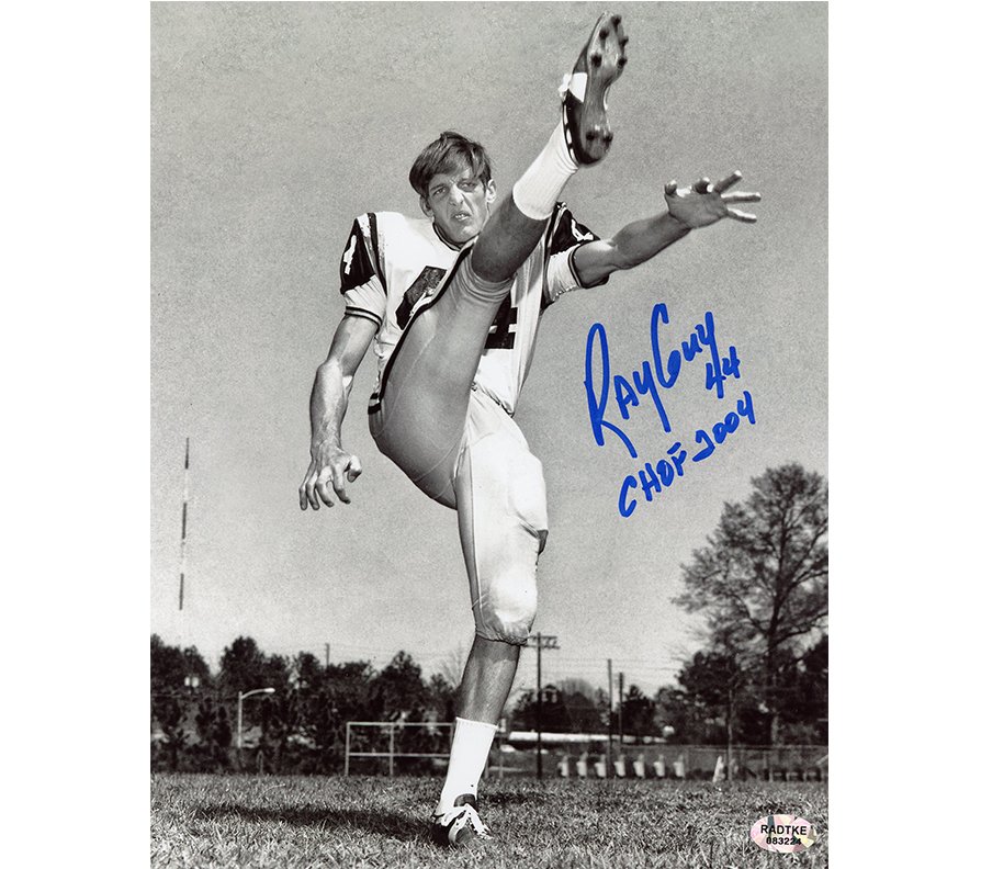 A Southern Miss Golden Eagles Unframed 8x10 B&W NCAA Photo hand signed by Ray Guy. The item and signature are in excellent condition. In addition to signing his name, Ray also inscribed "CHOF 2004" on the item. Ray is a 7x Pro Bowler, 6x All-Pro, 3x NFL Super Bowl Champion, A memeber of the NFL's 75th Anniversary Team & Class of 2004 NCAA HOF Inductee. AUTHENTICATION: The item is accompanied by a Radtke Sports Certificate of Authenticity - Radtke Sports Serial Numbered Hologram - A picture of Ray from the signing. ***Radtke Sports uses professional lighting for our product images that may show reflections. We also feature watermarks on our proof pictures. The picture you receive will NOT have a watermark.***