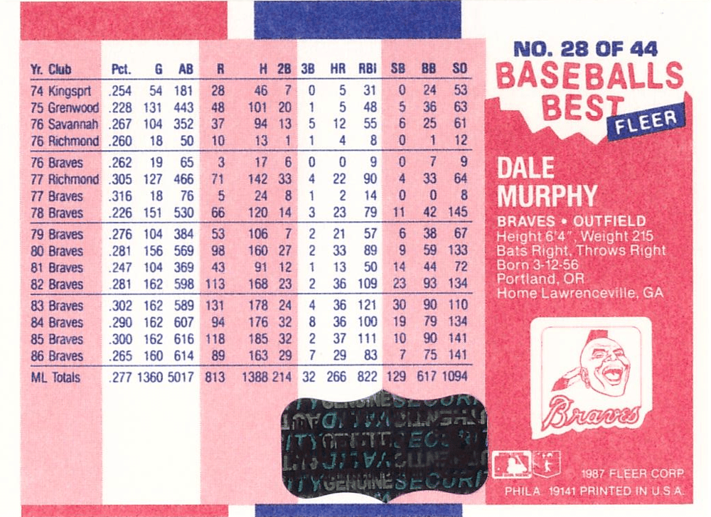 A 1987 Fleer #28 Atlanta Braves Baseball Card hand signed by Dale Murphy. The card features some of Dale's career stats. AUTHENTICATION: The item is accompanied by a Dale Murphy Certificate of Authenticity - Dale Murphy Sports Serial Numbered and Databased Hologram - Picture of Dale from the signing **** Radtke Sports uses professional lighting for our product images. The lighting will sometimes produce reflections on shiny surfaces. We also feature watermarks on our proof pictures. The picture you receive will NOT have a watermark*****