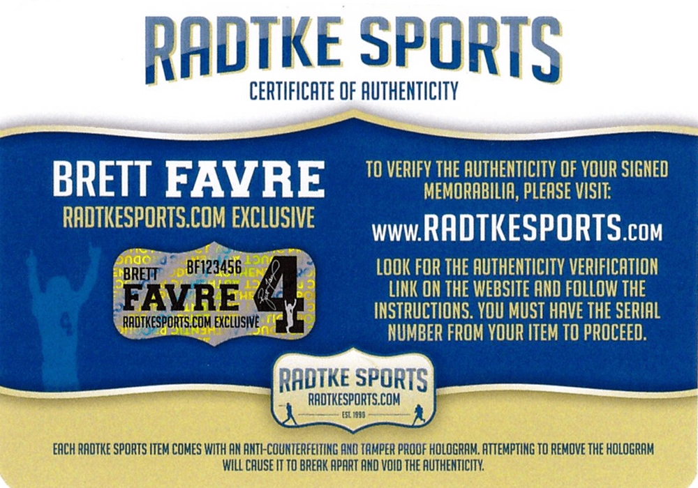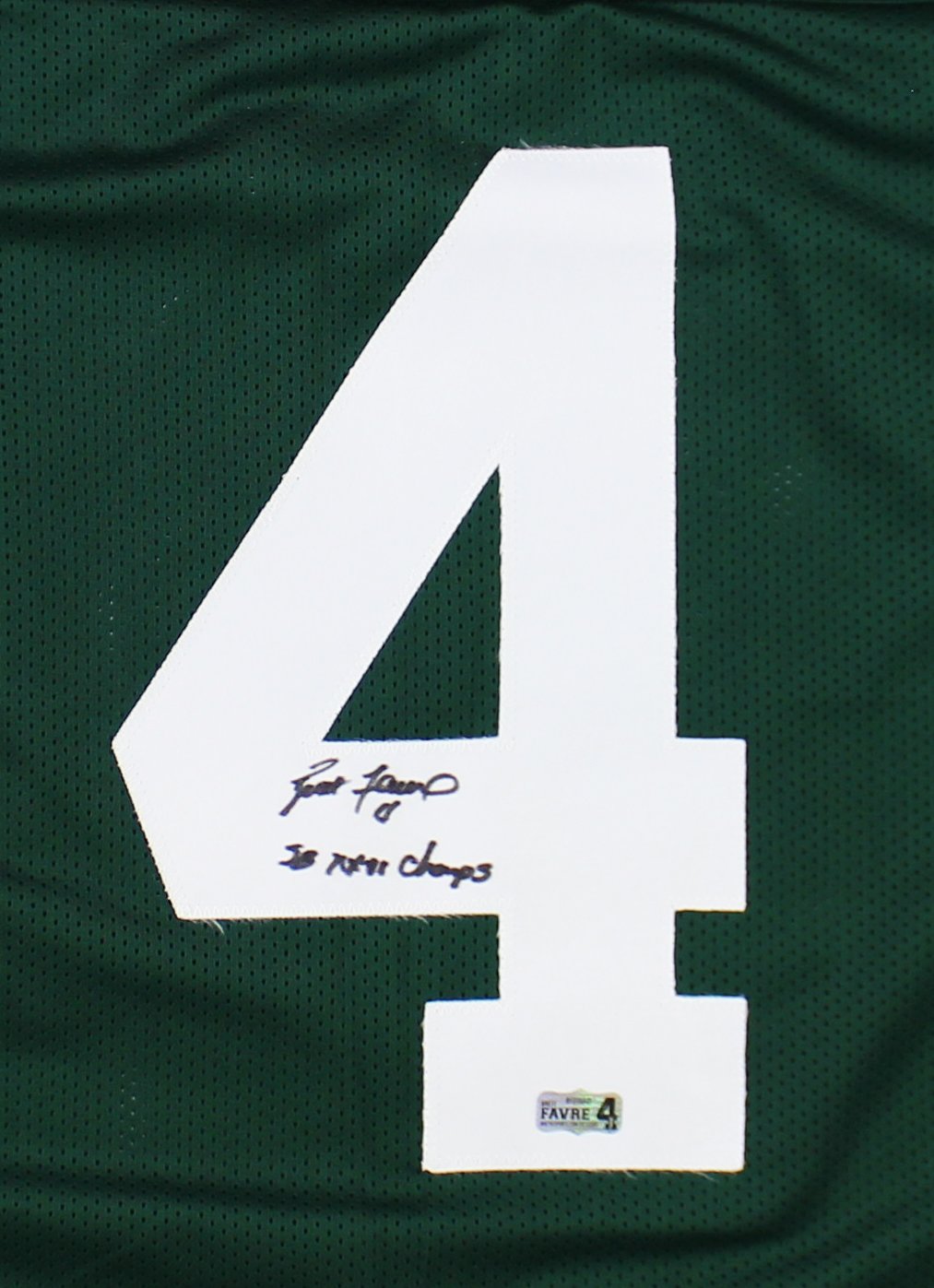 A Green Bay Custom Green Jersey hand signed by Brett Favre. The item and signature are in excellent condition. In addition to signing his name, Brett also inscribed "SB XXXI Champs" on the item. A 20 year veteran of the NFL, Brett is a Super Bowl Champion, 11x Pro Bowler, 3x AP NFL Most Valuable Player, 4x NFL passing touchdowns leader, and 2x passing yards leader. His number, 4, has been retired by both the Green Bay Packers and the Southern Miss Golden Eagles. Brett was inducted into the Pro Football Hall of Fame in 2016. AUTHENTICATION: The item is accompanied by a Brett Favre Exclusive Radtke Sports Certificate of Authenticity - Brett Favre Exclusive Radtke Sports Serial Numbered and Databased Hologram - Picture of Brett from the signing ***Radtke Sports uses professional lighting for our product images that may show reflections. We also feature watermarks on our proof pictures. The picture you receive will NOT have a watermark. ***